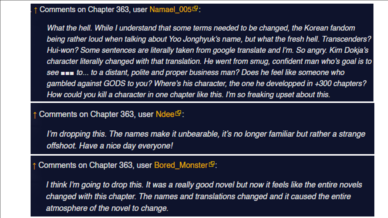 Penerjemah juga harus siap menerima kritik dan masukan dari pembaca. Pada novel "Omniscient Reader's Viewpoint" misalnya, di awal novel Korea ini diterjemahkan oleh translator dengan nama pena RainbowTurtle (RT). Kemudian mulai dari chapter 363, alih bahasa dilanjutkan oleh penerjemah beralias A_Passing_Wanderer (AWP). Selain gaya bahasa yang berubah, penulisan nama tokoh dan beberapa terminologi pun berubah oleh AWP pun berbeda. Walaupun perubahannya minor seperti nama tokoh utama yang awalnya ditulis "Yoo Joonghyuk" berubah menjadi "Yu Jung-Hyeok", ternyata banyak fans yang tidak terima. Beberapa sampai ada yang menulis komentar ekstrem seperti penerjemah yang baru "membunuh karakter" yang sudah dibangun selama lebih dari 300 bab atau ada yang berhenti karena nuansa ceritanya berubah. Alasan perubahan penulisan ini karena AWP mengikuti standar penulisan ke bahasa latin (romanization) dari bahasa korea yang telah direvisi. Sebagian pembaca mendukung inisiatif ini, tapi ternyata banyak juga yang lebih nyaman dengan penulisan yang lama (walau tidak mengikuti standar penulisan). Jika tidak memiliki mental yang kuat, bisa jadi translator berhenti menerjemahkan novel ini.